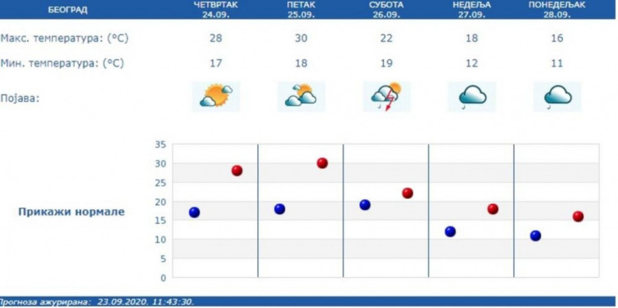 U Srbiji će u petak biti promenljivo oblačno i toplo, posle podne ponegde kratkotrajna kiša, a tokom noći i u subotu jače naoblačenje s kišom, pljuskovima, grmljavinom i značajnim padom temperature.