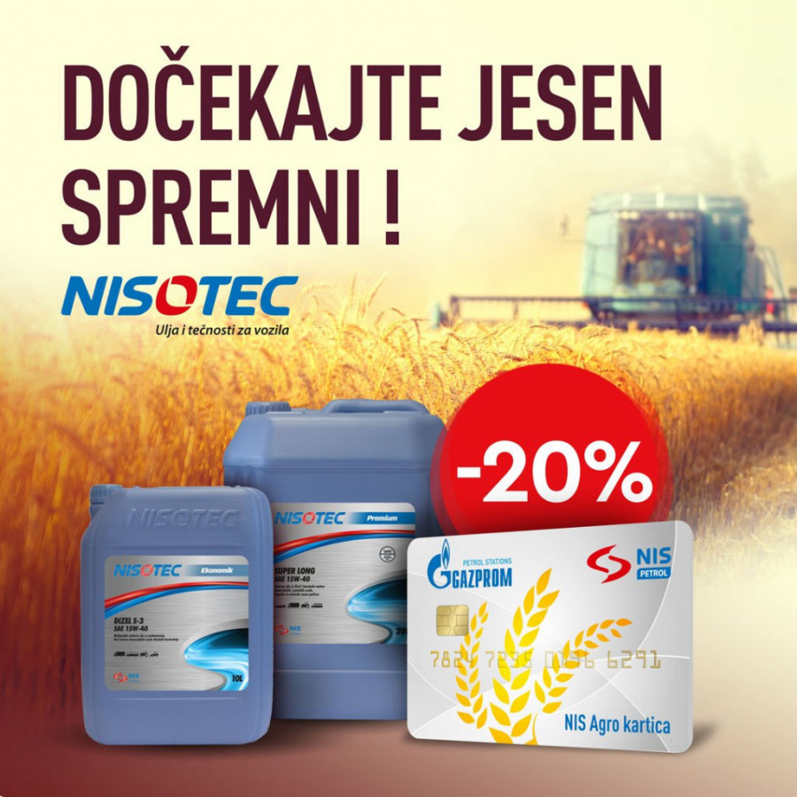Foto: NISKorisnicima NIS Agro kartice odobren je poseban popust od 20 odsto na deo proizvoda za poljoprivrednu mehanizaciju u pakovanjima od 10 i 20 litara koji će trajati do kraja oktobra. Pored toga, u istom vremenskom periodu, za korisnike kartice lojalnosti „Sa nama na putu“ takođe je pripremljen popust od 20 odsto na deo asortimana motornih ulja od 1 litar.