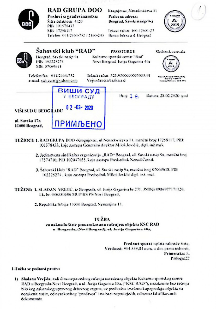 Miloš Jovičić, generalni direktor "Rad grupe" i predsednik ŠK Rad, objavio je i predao sudu jasne dokaze da se radi o falsifikovanju i prevari. On je za naš list potvrdio da je glavna rasprava završena, ali nije želeo da prejudicira ishod postupka.