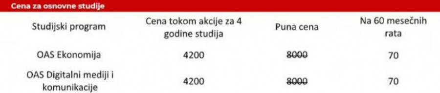 Cena studija za osnovne studije iznosi za godinu studija samo 1050 evra po godini i omogućeno je plaćanje školarine na 60 rata, samo za one koji se prijave do kraja novembra.