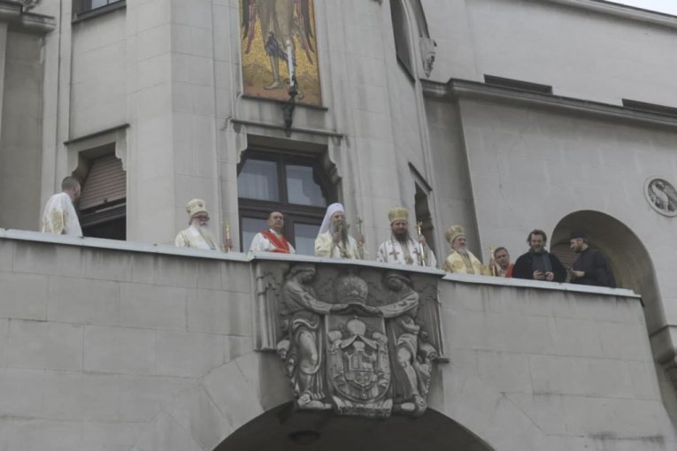Na balkonu se pojavio zajedno sa vladikama SPC, odakle je blagosiljao okupljene ispred Patrijaršije.