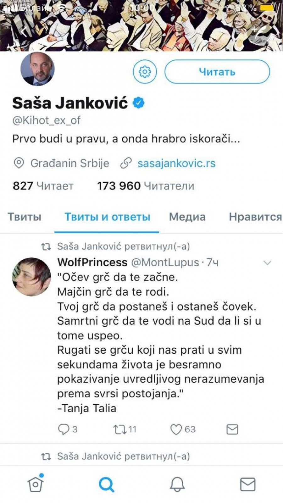 Naime, bivši zaštitnik građana je retvitovao post jedne tviterašice - reč je praktično o stihovima posvećenim značaju grčenja za ljudsko postanje - a potom je iznad toga napisao: "Prvo budi u pravu, a onda hrabro iskorači..."
