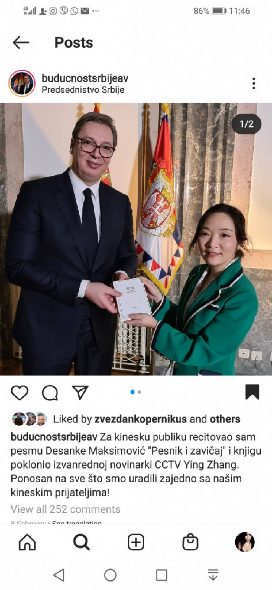 - Definitivno pesma koju mi je Vučić odrecitovao, "Pesnik i zavičaj" iz knjige Desanke Maksimović. Sada je veoma popularna u Kini. Preveli smo je na kineski i mandarinski jezik i pozvali smo jednog od najboljih spikera da je pročita na kineskom i to je zaista prelepo i objavili smo na našem veb-sajtu na kineskoj društvenoj platformi. Čak su napravili i poster Vučića sa crvenom pozadinom, budući da je crvena u našoj kulturi omiljena. Predsednik Vučić je superstar, ne možete ni da zamislite.
