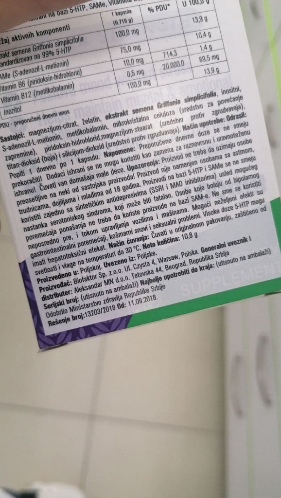 Popijete jednu čarobnu pilulu i odmah ste srećni. Ovako bi, ukratko, izgledala reklama za prodaju suplementa 5-HTP + same stress&mood, koji se na internetu reklamira kao ekstra jak hormon sreće u kapsuli. Kutija od 15 tableta košta 1.400 dinara, a prodaje ga firma "Aleksandar MN".
