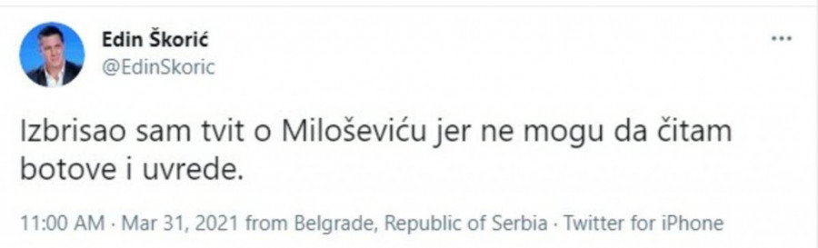 Odbojkaš Edin Škorić reagovao je na vest o pismu koje je Marija Milošević, ćerka nekadašnjeg predsednika SR Jugoslavije Slobodana Miloševića, napisala nakon smrti oca.
