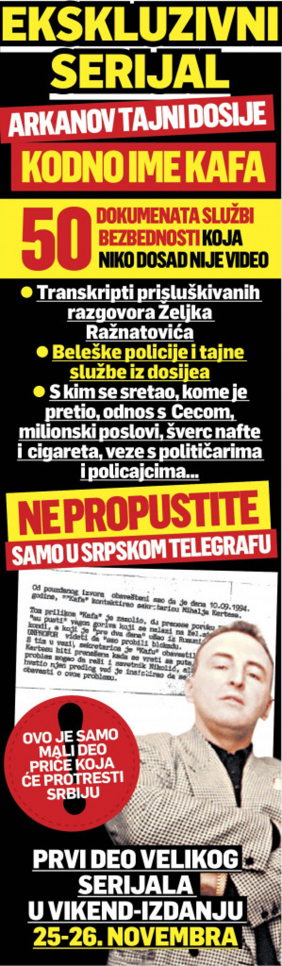 Srpski telegraf će napraviti pravu revoluciju na medijskoj sceni, pošto ćemo u vikend izdanju od 25-26. novembra objaviti prvi deo ekskluzivnog serijala koji će protresti Srbiju - Arkanov tajni dosije, koji će biti objavljen i na portalu Republika.rs!