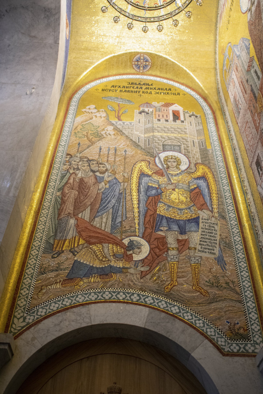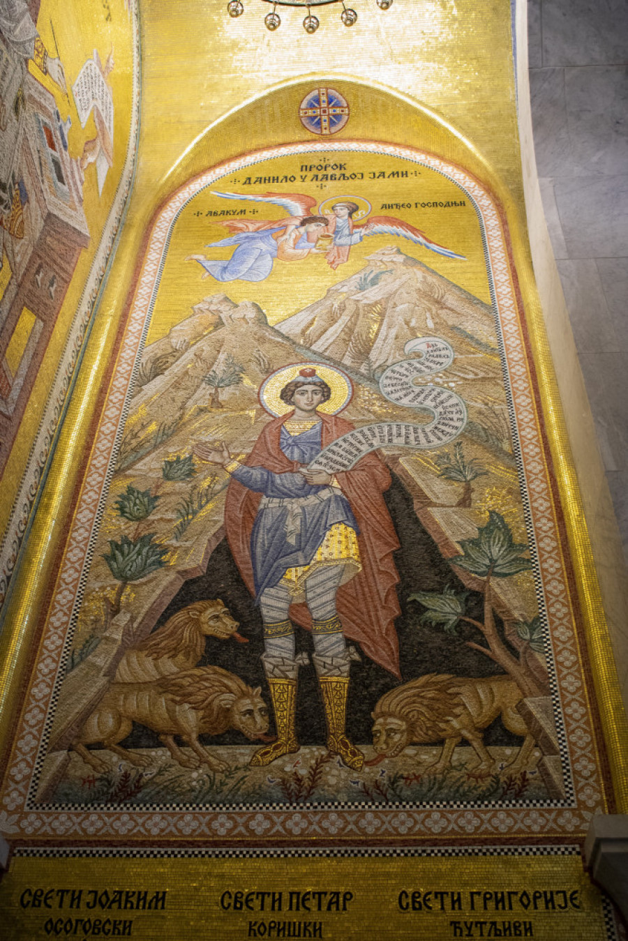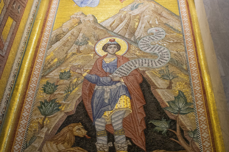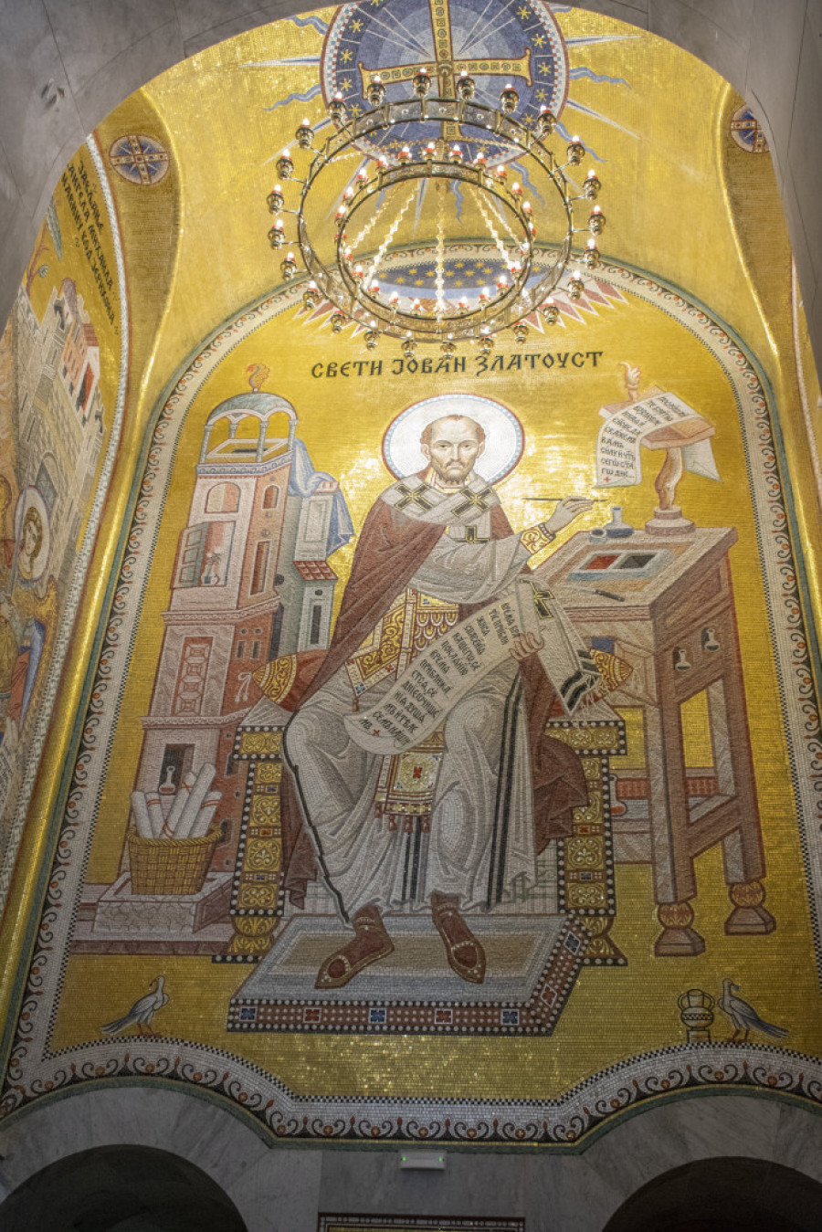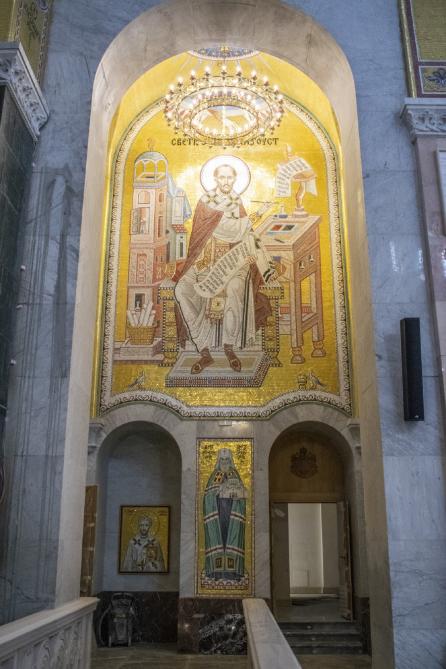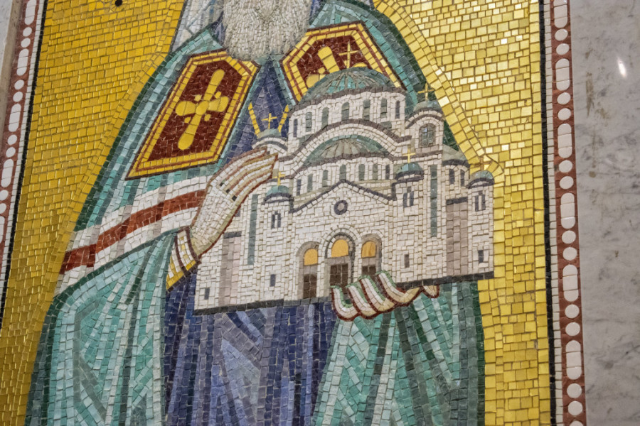 Foto: ST/Petar DivacOba mozaika, delo su ruskih umetnika i majstora na čelu sa akademikom Nikolajem Muhinom. Jedan se nalazi u oltarskom delu, zajedno sa drugim patrijarsima, dok je drugi na severoistočnoj strani Hrama, kod severoistočnog ulaza u Kriptu Hrama, ispod paraklisa posvećenog despotu Stefanu Lazareviću.