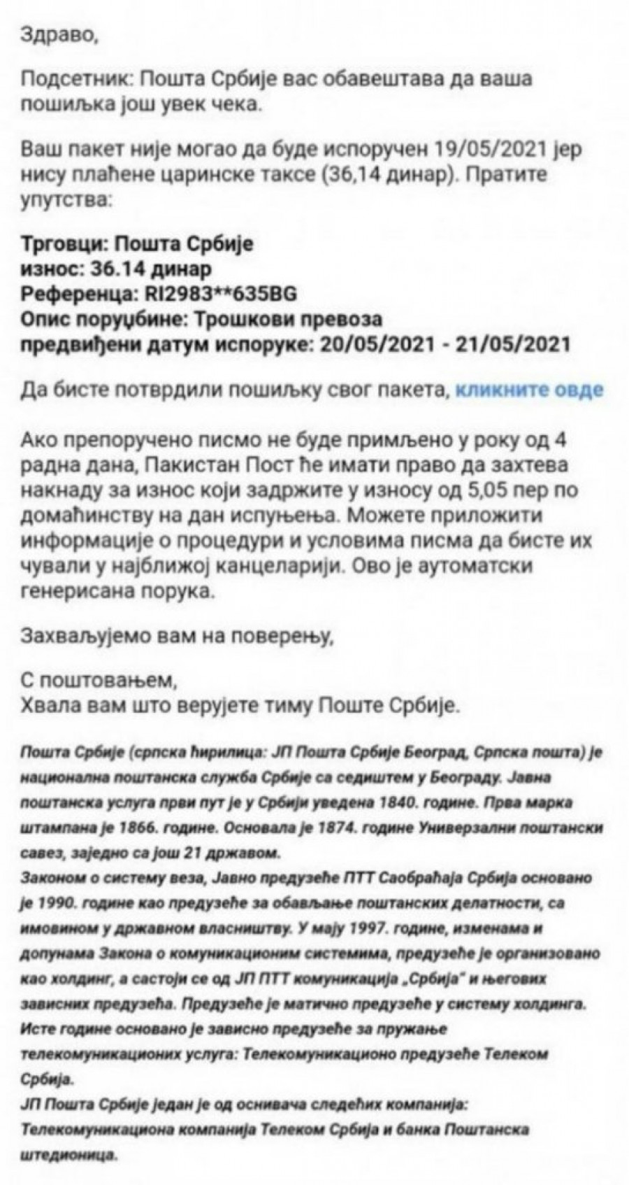 Ukoliko ste dobili mejl koji je naslovljen kao "Pošta Srbije", a u kojem vas obaveštavaju da morate da platite određen iznos da biste podigli paket, velika je verovatnoća da ste na meti prevaranata. Zato vodite računa da ne postanete još jedna u nizu žrtava internet prevare.