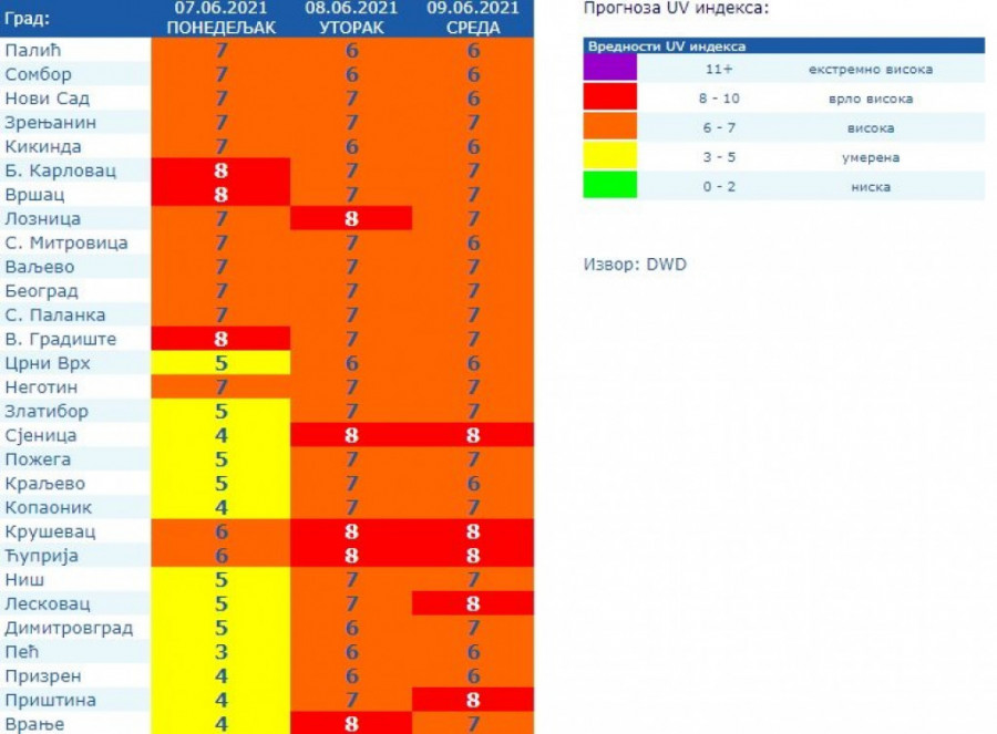 Nešto niži UV indeks biće u Ćupriji i Kruševcu, dok će umerneo zračenje biti na jugu zemlje. Dakle - Niš, Leskovac, Dimitrovgrad, Peć, Prizren, Priština, Vranje, ali i u centralnim delovima - od Požege preko Zlatibora, Sjenice, Kopaonika, pa i Kraljeva.