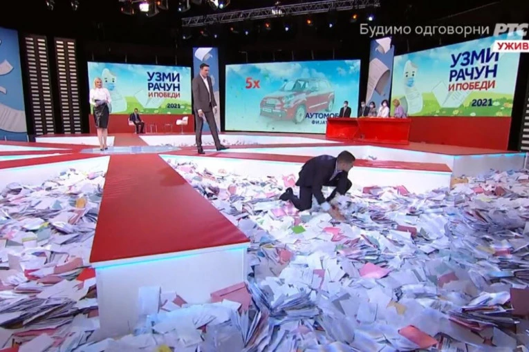 Foto: printscreen/RTSSrećne dobitnike nagradne igre "Uzmi račun i pobedi 2021", iz bazena u studiju Radio-televizije Srbije sa 5.201.645 pristiglih koverti, izvukao je karatista Slobodan Bitević.