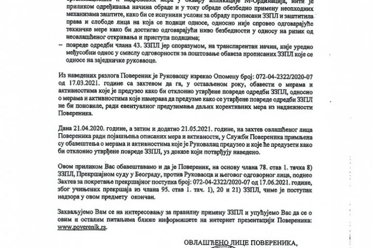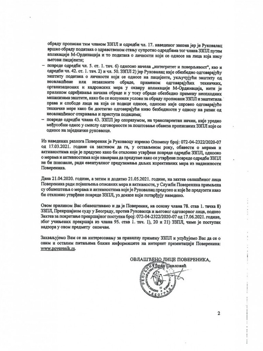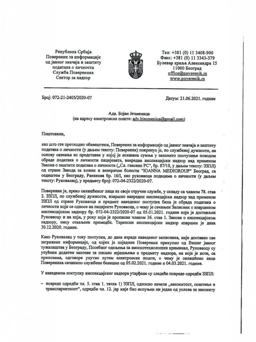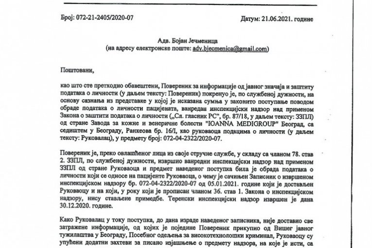 U izveštaju poverenika jasno se navodi da su poverljivi lični i medicinski podaci pacijenata procurili iz jedne od klinika "Medigrupe". Konstatuje se i koji su sve članovi Zakona o zaštiti podataka o ličnosti prekršeni (pogledajte dokument u prilogu).