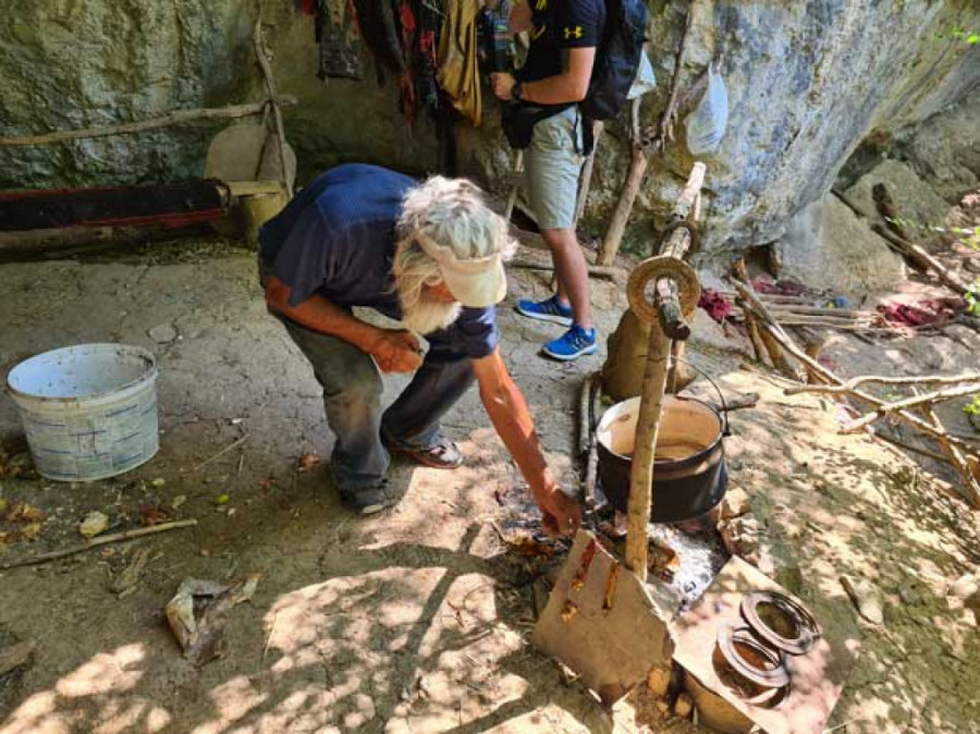 U pećini ima zimnicu staru pet godina. Tada nam objašnjava da na temperaturi u njegovoj pećini paprika, koju svi volimo, ne može da se pokvari. Rešio je i da nam otkrije da do njegove pećinske kuće ima tri puta. Jedan za pijane da bi bezbedno mogli da siđu s planine. Jedan malo strmiji za one malo manje pijane. I treći za trezne. To je put kojim je nas sproveo.