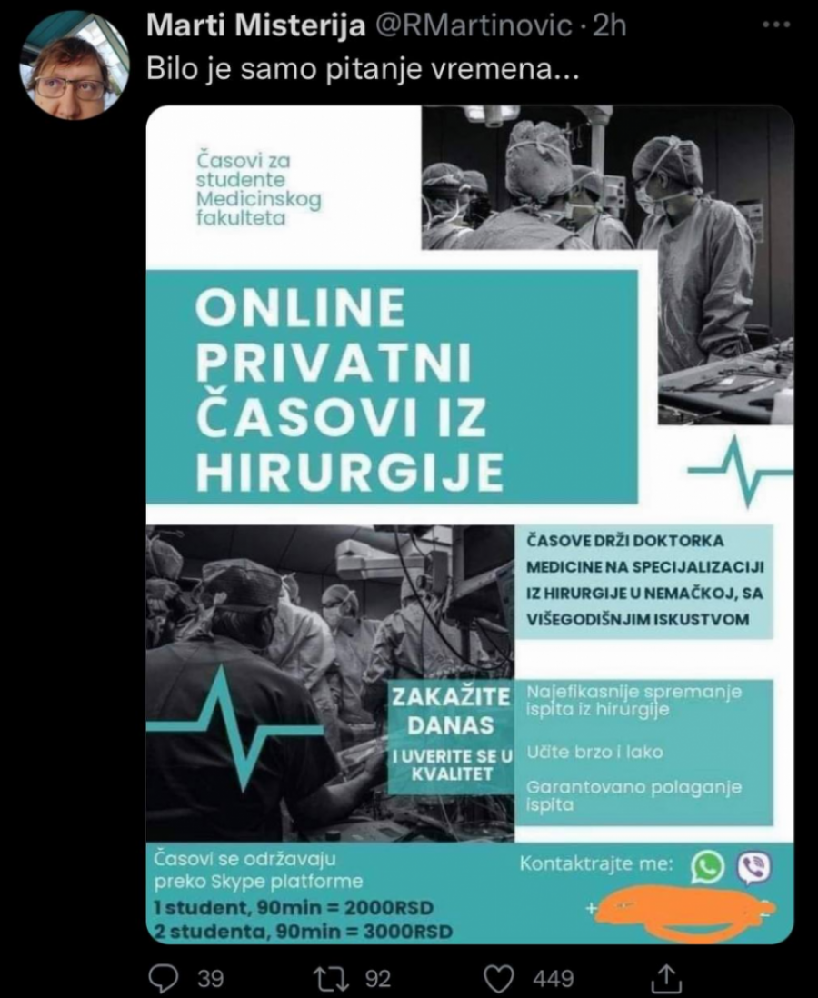 Na društvenim mrežama pojavio se oglas u kom jedna doktorka nudi privatne onlajn časove iz hirurgije za studente Medicinakog fakulteta.