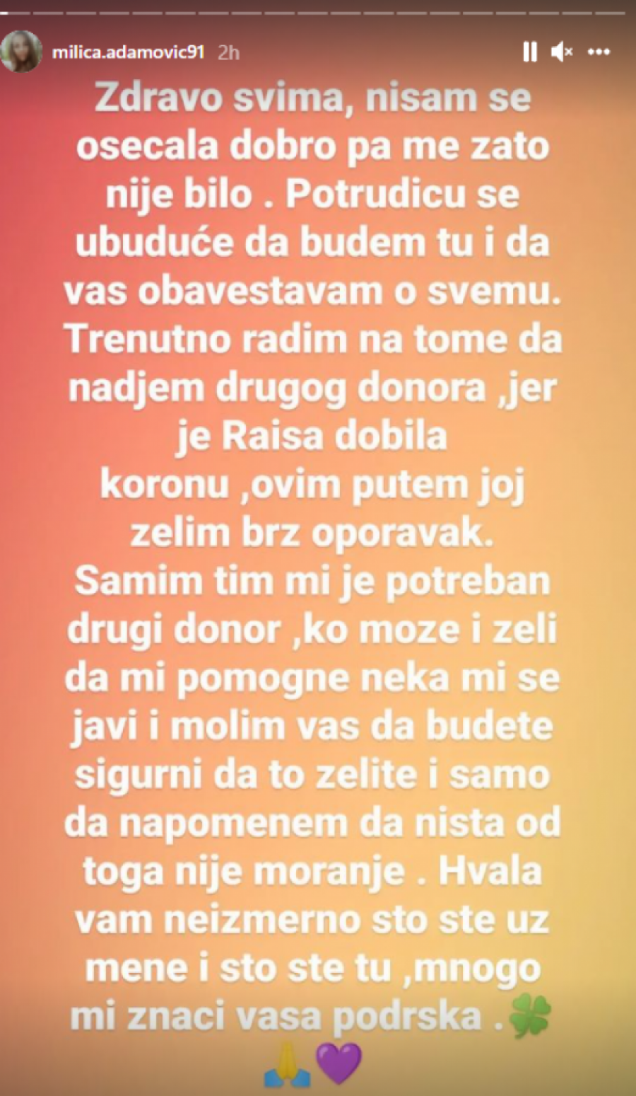 - Nisam se osećala dobro, pa me zato nije bilo. Potrudiću se ubuduće da budem tu i da vas obaveštavam o svemu. Trenutno radim na tome da nađem drugog donora, jer je Raisa dobila koronu. Ovim putem joj želim brz oporavak. Samim tim mi je potreban drugi donor, ko može i želi da mi pomogne neka mi se javi, i molim vas da budete sigurni da to želite. Samo da napomenem da ništa od toga nije moranje. Hvala vam neizmerno što ste uz mene i što ste tu - napisala je Milica.