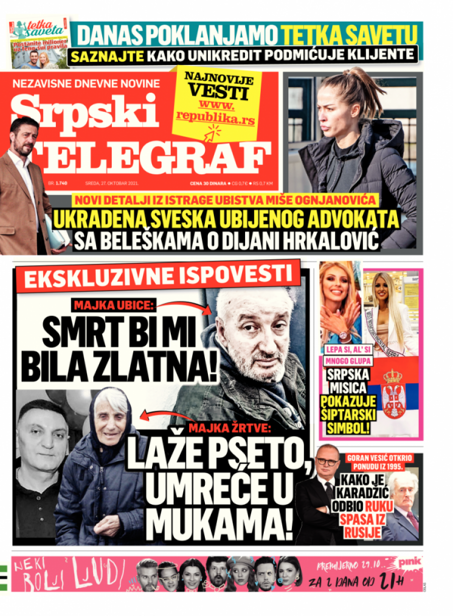Srpski telegraf u štampanom izdanju za 27. oktobar donosi pregršt važnih i interesantnih priča.