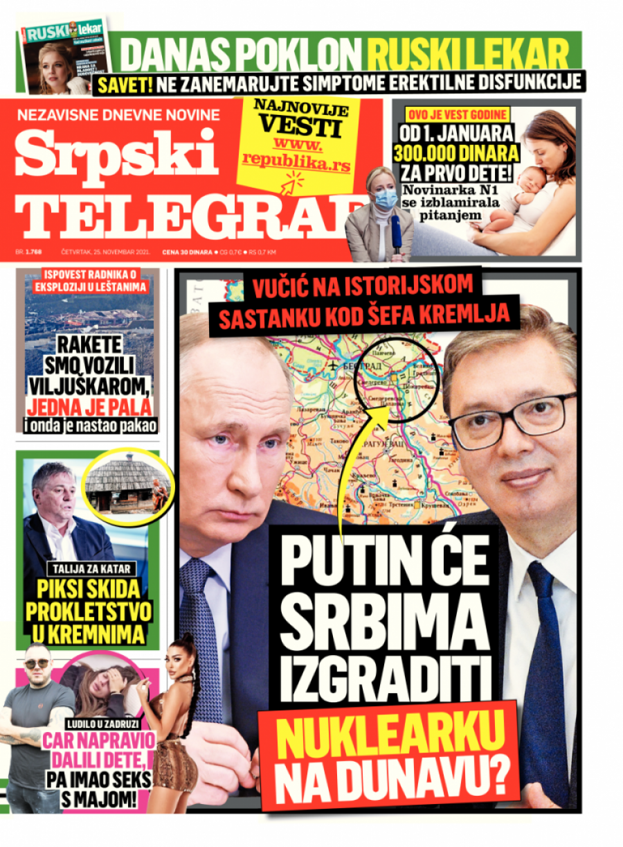 Srpski telegraf u štampanom izdanju za četvrtak 25. novembar donosi pregršt važnih i interesantnih priča: