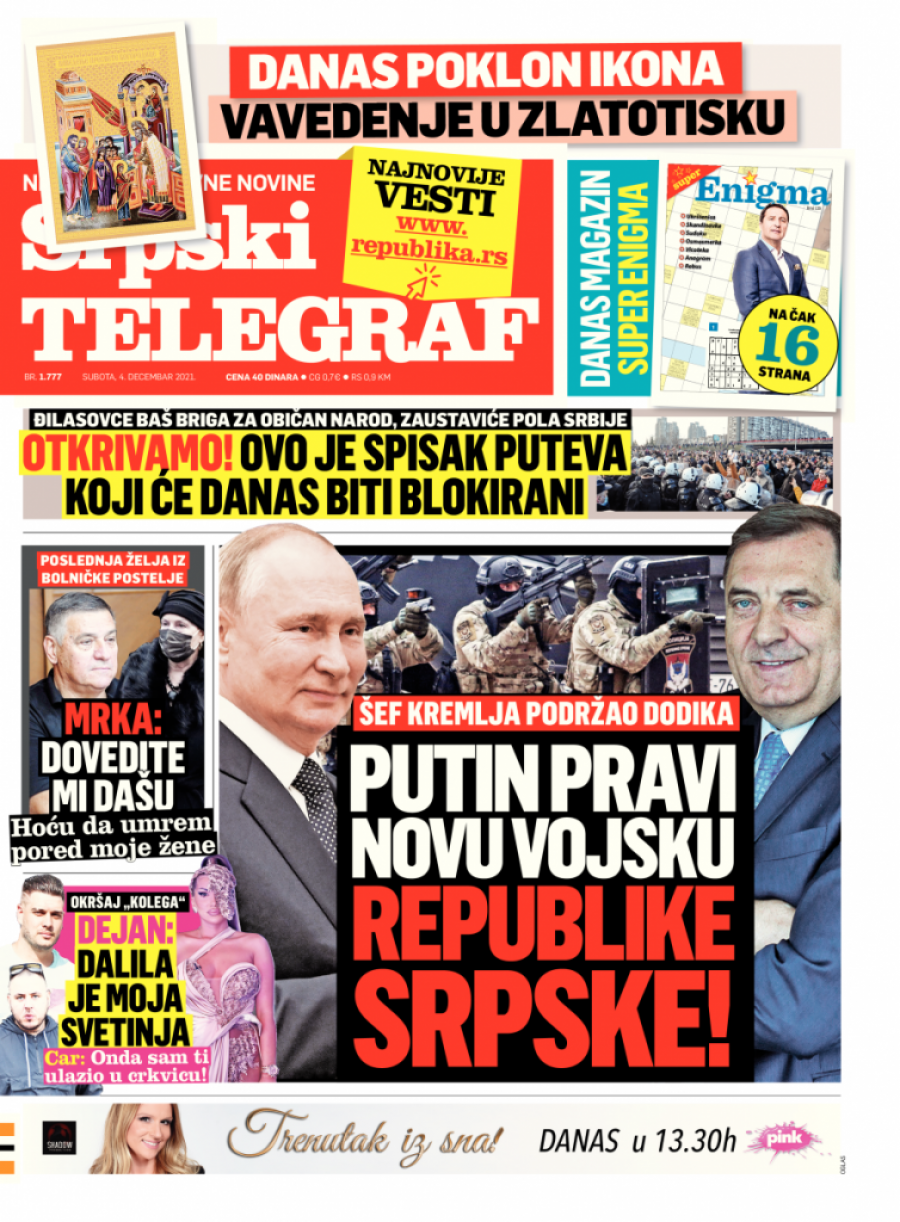 Srpski telegraf u štampanom izdanju za subotu 4. decembar donosi pregršt važnih i interesantnih priča: