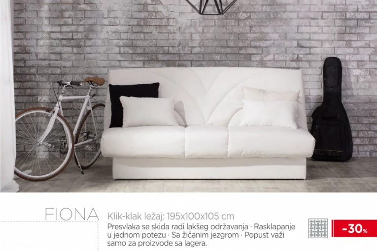 Za sve ljubitelje klasičnog dizajna, koji praktikuju kombinaciju funkcionalnog i udobnog nameštaja za dnevni odmor i spavanje, preporuka su klik-klak ležajevi, kaučevi i kreveti. Na popustu -30% su modeli sa lagera - „Fiona“ sa presvlakom koja se skida radi lakšeg održavanja, „Knjaz“, „Onix“ i „Gordana“, sa žičanim jezgrom i prostorom za odlaganje posteljine, koji plene jednostavnim dizajnom i udobnošću.