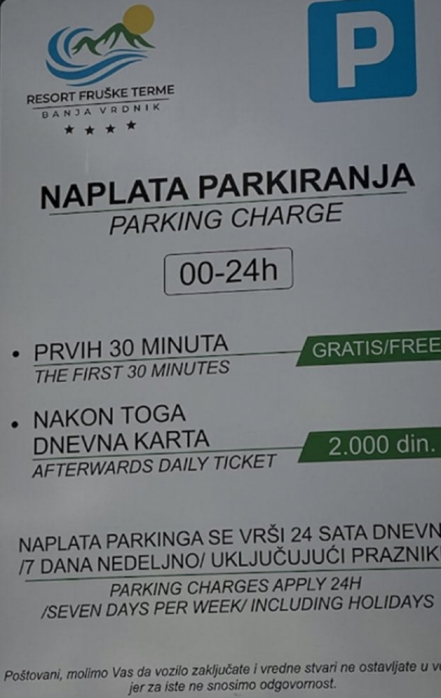 - Na sajtu hotela "Fruške terme" precizno je napisano da gosti koji koriste uslugu smeštaja imaju obezbeđen gratis parking u garaži, udaljenoj svega 100 metara od velnes recepcije, odnosno 250 metara od glavne recepcije hotela. Zbog ograničenog broja mesta, gratis parking ispred hotela je dostupan samo prilikom prijave i odjave gostiju u trajanju od 30 minuta. S obzirom na to da se parkiranje ispred hotela, duže od 30 minuta, tretira kao dnevni parking, naplaćuje se po utvrđenom cenovniku - piše u mejlu.