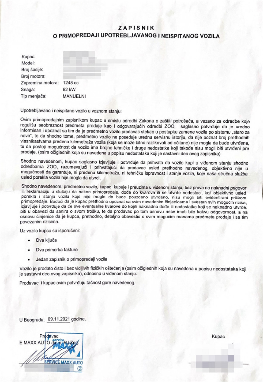 On za kupljeno vozilo poseduje fiskalni račun i zapisnik o predaji automobila, ali ne i garanciju.