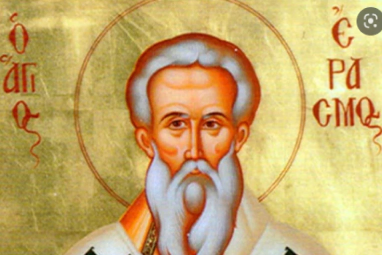 Sv. Erazmo je bio rodom iz Antiohije. Od malih nogu marljivo je služio Gospodu. U zrelim godinama uzdignut je na čin episkopa grada Formija (Italija).