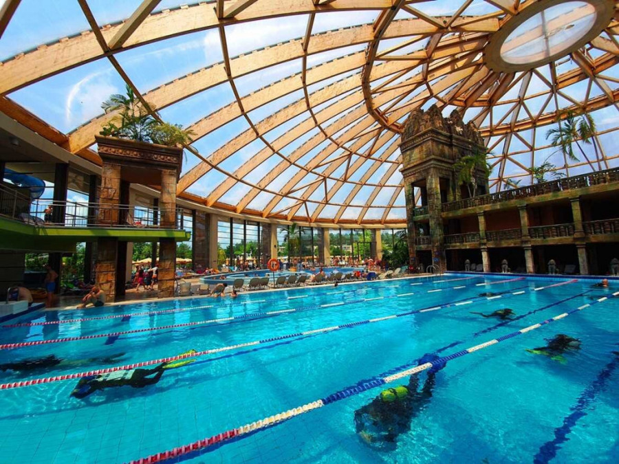 Kompleks raspolaže sa više otvorenih i zatvorenih bazena sa toplom i hladno vodom, a gostima su na raspolaganju velika hotelska “plaža”, bazenski barovi, brojni restorani, zatim više sauna, adrenalinski park, a oni najmlađi svakako najviše uživaju u najvećem evropskom spray parku za decu.