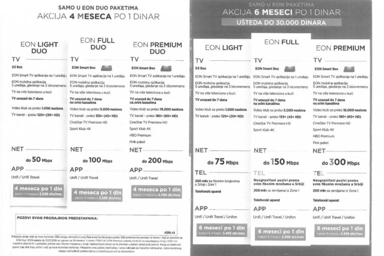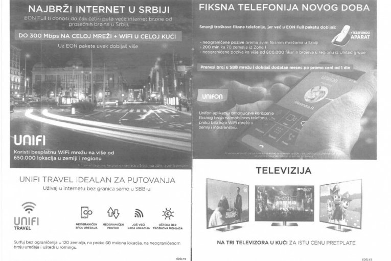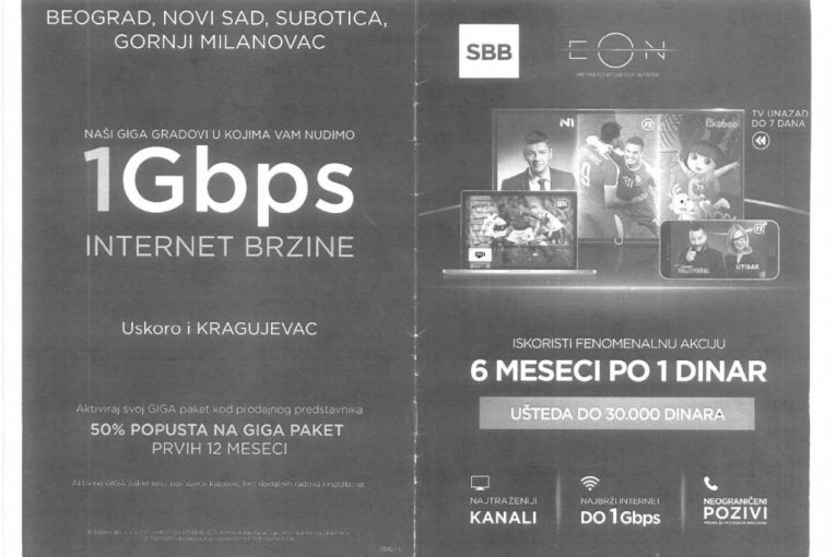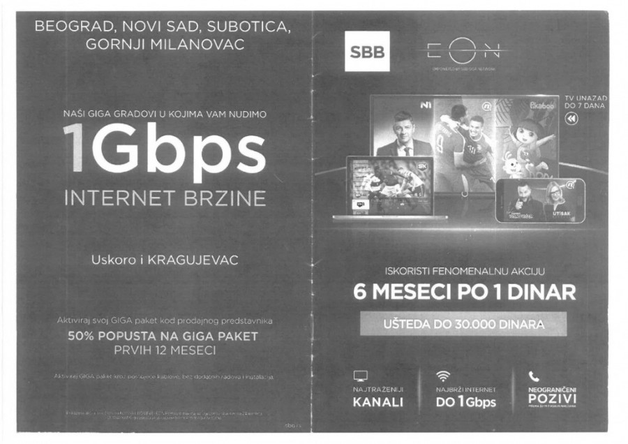 Nije istinita informacija da SBB svojim korisnicima šalje flajere kojim reklamira medijske sadržaje koji nisu u ponudi ovog kablovskog operatora, pa ni da je poslala izvesnom J.S. takav flajer. Trenutni reklamni materijal koji SBB koristi za tekuće kampanje, nema apsolutno nikakve veze sa flajerima koji su, ponavljamo, korišćeni jos u julu 2019. godine. U prilogu vam šaljemo aktuelni promotivni materijal koji se vezuje za akcije iz juna 2022. godine.