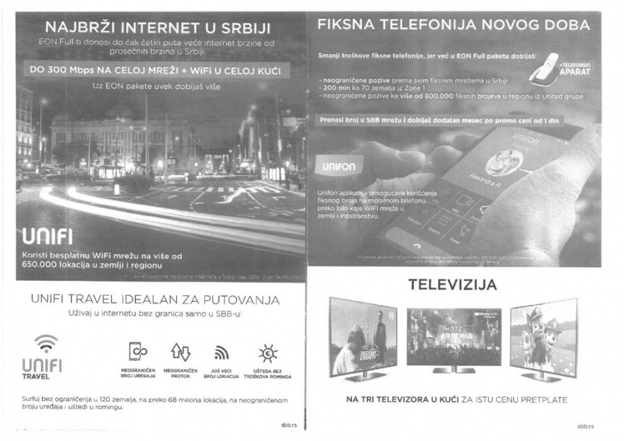 Imajući u vidu sve navedeno, nisu istinite informacije da SBB vrši obmanjujuće oglašavanje, prevarne aktivnosti, niti bilo šta slično, a u oglašavanju i pružanju svojih usluga poštuje sve primenjive propise Republike Srbije."