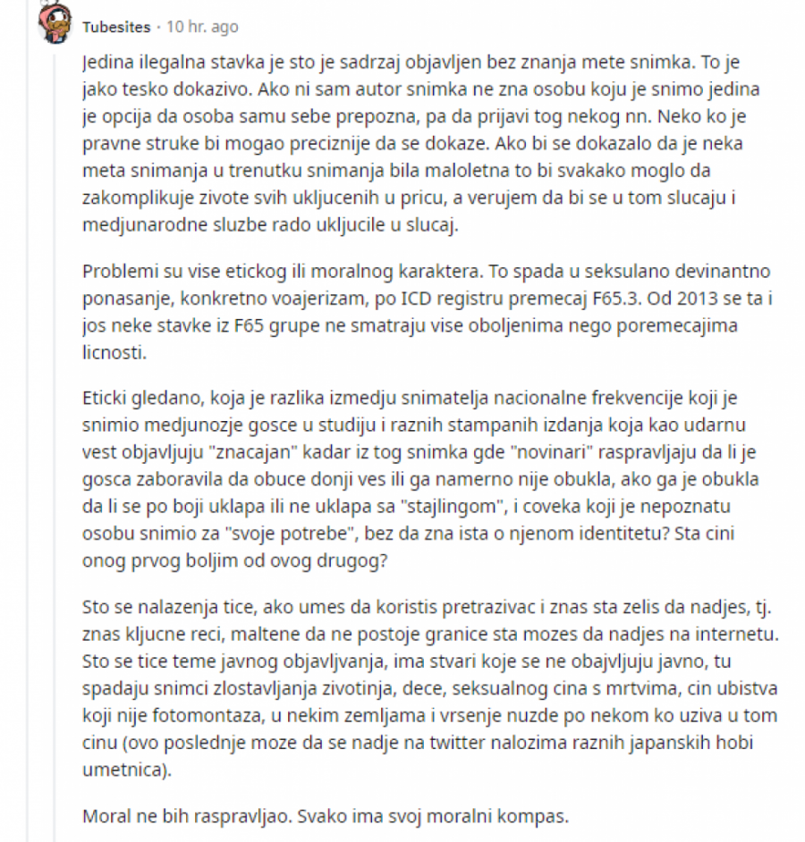 - Jedina ilegalna stavka je sto je sadržaj objavljen bez znanja mete snimka. To je jako teško dokazivo. Ako ni sam autor snimka ne zna osobu koju je snimo jedina je opcija da osoba samu sebe prepozna, pa da prijavi tog nekog - navodi korisnik Reddita, upisan kao Tubesites i dodaje: