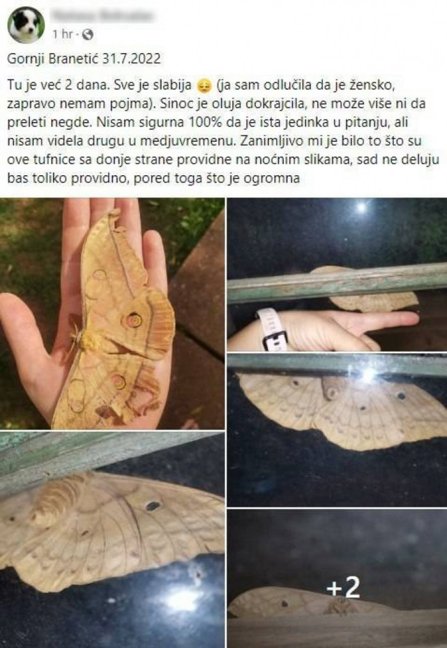- Sinoć je oluja dokrajčila, ne može više ni da preleti negde. Nisam sigurna 100% da je ista jedinka u pitanju, ali nisam videla drugu u međuvremenu. Zanimljivo mi je bilo to što su ove tufnice sa donje strane providne na noćnim slikama, sad ne deluju baš toliko providno, pored toga što je ogromna - navela je ova korisnica i podelila nekoliko fotografija pomenutog leptira.
