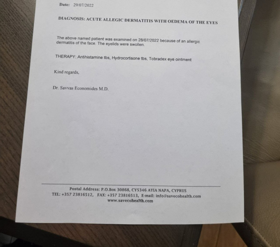 - Akutna alergija sa otokom ispod oka, ne piše alergiaj na sunce niti koja terapija je prepisana. Kada smo supruga i ja pozvali da ih pitamo šta da radimo, rekli su nam da nemaju direktnu zdravstvenu ustanovu sa kojom na Kipru u Aja Napi sarađuju i da imamo dve opcije. Prva je bila tražimo nekog partnera koji bi mogo da pruži zdravstvenu pomoć, ali ko zna kad bi to bilo, a druga opcija je podrazumevala da sami nađemo nekog gde se nalazimo, da nam on ukaže zdravstvenu negu i da onda od ove osiguravajuće kuće sve to refundiramo - navodi naš sagovornik.
