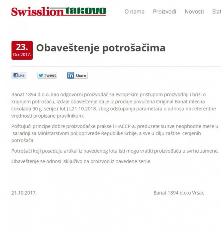 Redovnom kontrolom u magacinu proizvođača, koji posluje u okviru grupacije "Swisslion Takovo", inspektori su ustanovili ovu nepravilnost i naložili toj kompaniji povlačenje kompletne serije mlečne čokolade sa visokim sadržajem mleka - u pakovanju od 90 grama.