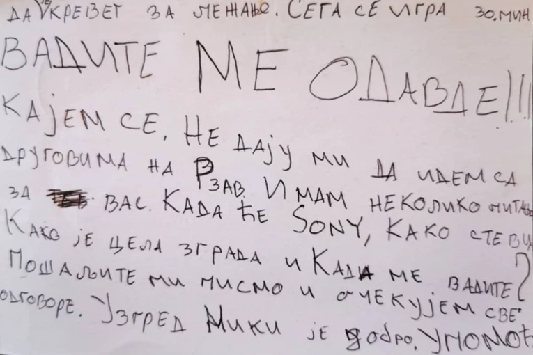 - Dragi mama i tata, ovde je ružno. Deda ne da da sednemo na krevet, pošto kaže da je krevet za ležanje. Sega se igra 30 minuta. Vadite me odavde!!! Kajem se. Ne daju mi da idem sa drugovima na Rzav. Imam nekoliko pitanja za vas. Kada će Soni, kako ste vi, kako je cela zgrada i kada me vadite? Pošaljite mi pismo i očekujem sve odgovore. Uzgred, Miki je dobro. Upomoć - stajalo je u apelu mališana Simića, koji je sudeći po sadržini pisma, u to vreme bio u pravoj "agoniji".