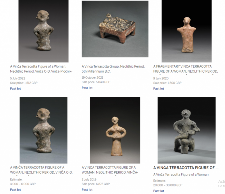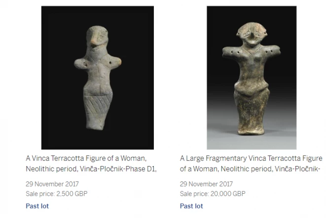 Na desetine figura koje datiraju još iz neolita, odnosno između 5000 i 4000 godina pre nove ere, a koje su navodno pronađene u Srbiji, dobar deo i na vinčanskom lokalitetu Pločnik kod Prokuplja, mogu se za par hiljada dolara pazariti na sajtu aukcijske kuće “Sotheby”.