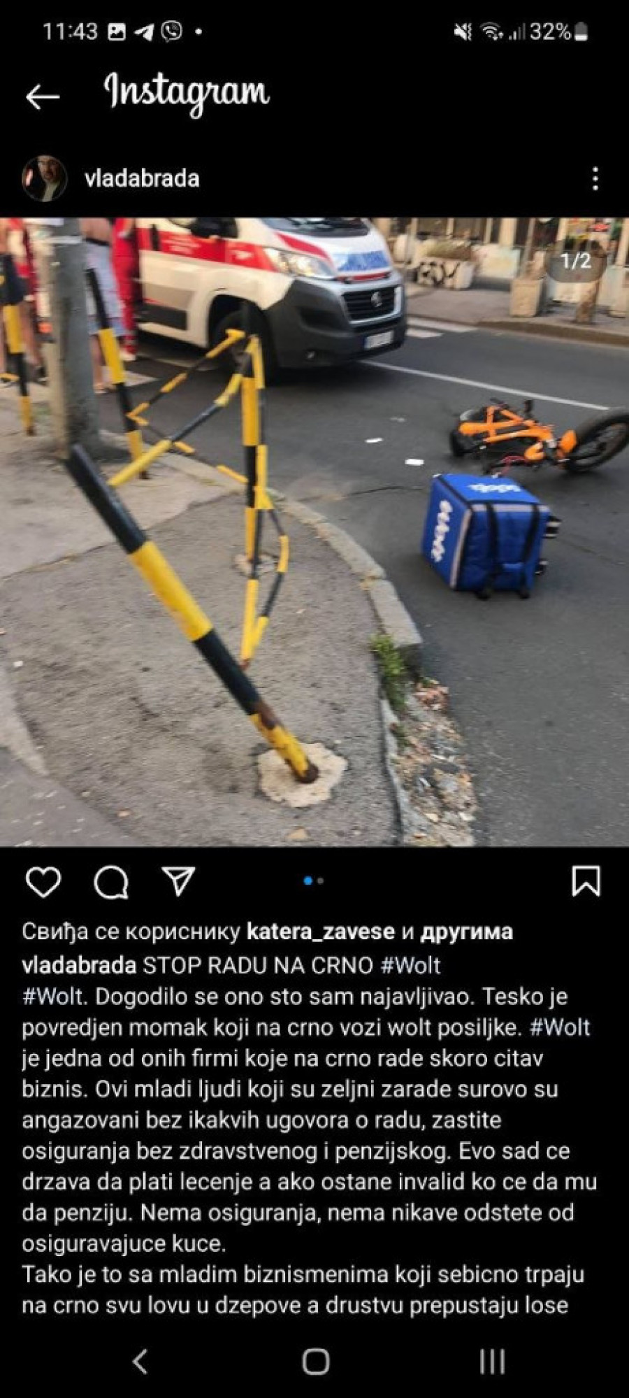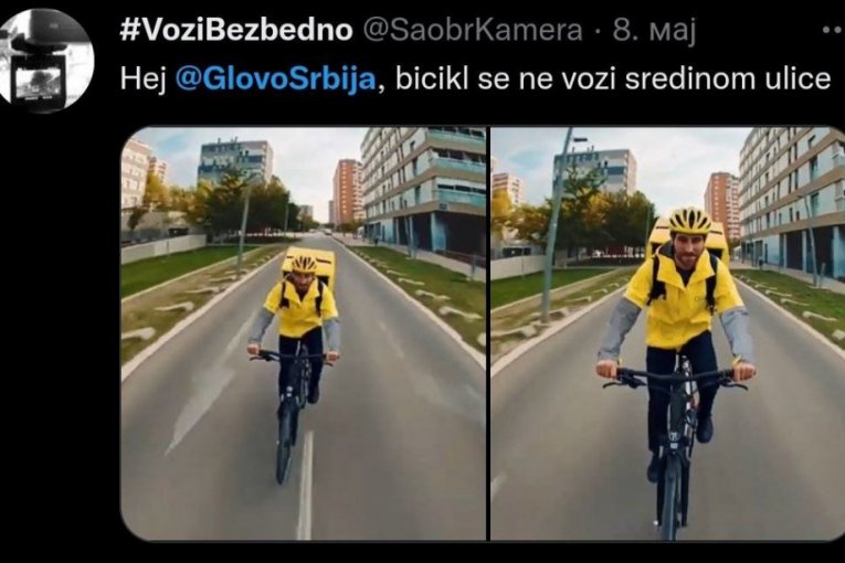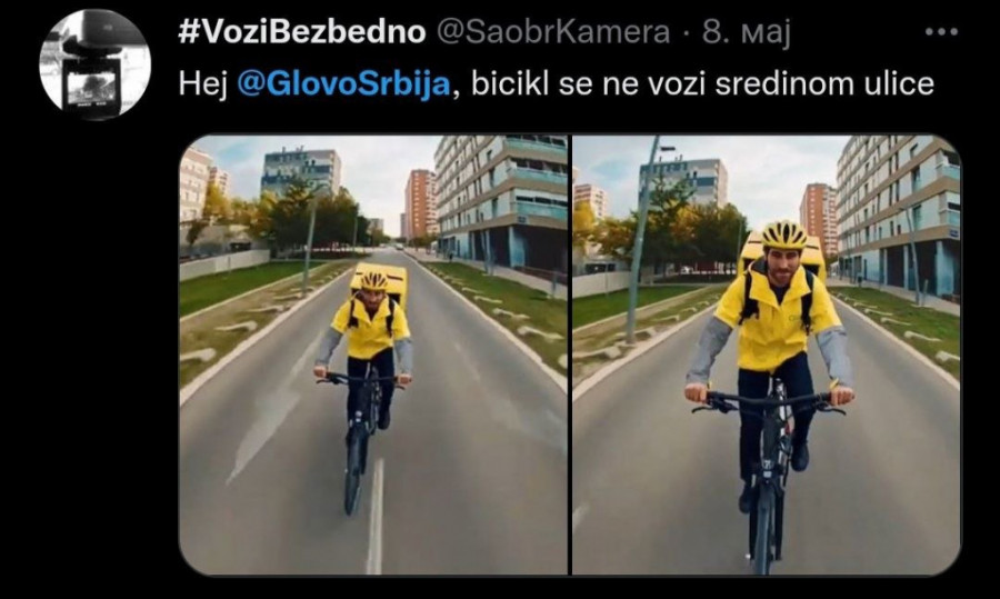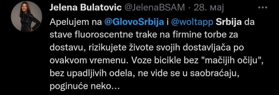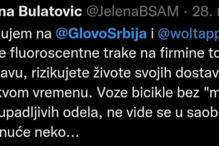 - Apelujem na Glovo i Wolt Srbija da stave fluoroscentne trake na firmine torbe za dostavu, rizikujete živote svojih dostavljača po ovakvom vremenu. Voze bicikle bez "mačijih očiju", bez upadljivih odela, ne vide se u saobraćaju, poginuće neko.