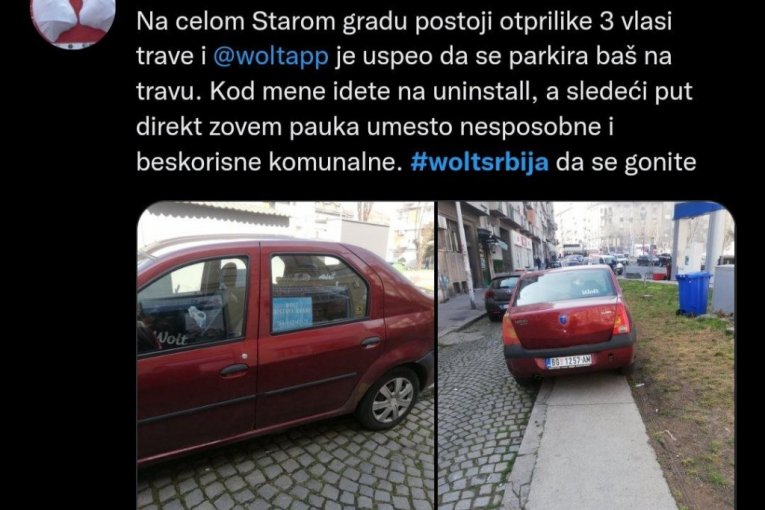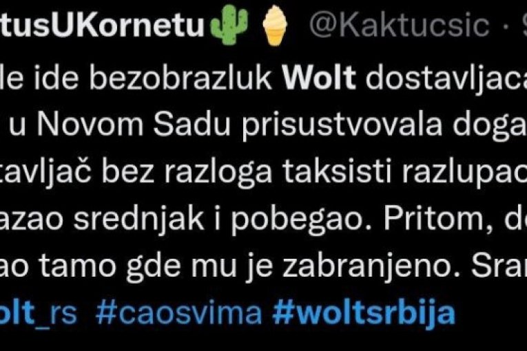 - Dokle ide bezobrazluk wolt dostavljača? Upravo sam u Novom Sadu prisustvovala događaju u kom je dostavljač bez razloga taksisti razlupao retrovizor, pokazao srednjak i pobegao. Pritom, dostavljač je stajao tamo gde mu je zabranjeno. Sramota! - navodi se na Tviteru.