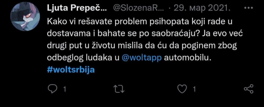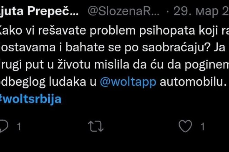 - Kako vi rešavate problem psihopata koji rade u dostavama i bahate se po saobraćaju? Ja evo već drugi put u životu mislila da ću da poginem zbog odbeglog ludaka u wolt automobilu.