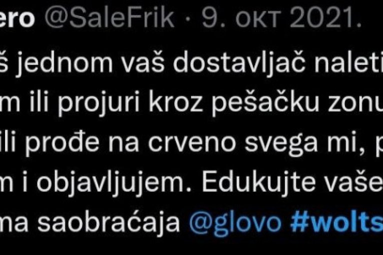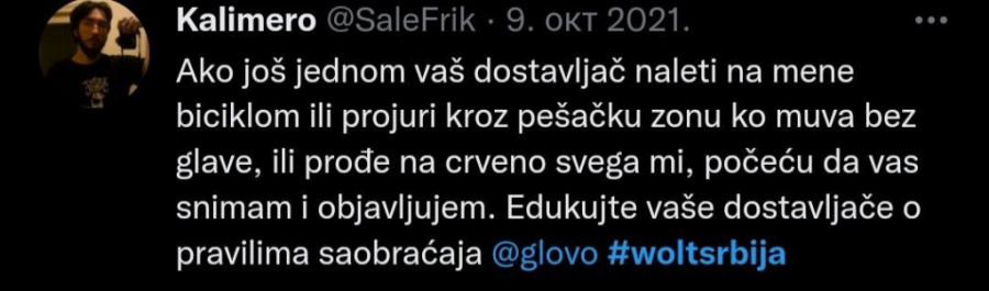- Ako još jednom vaš dostavljač naleti na mene biciklom ili projuri kroz pešačku zonu ko muva bez glave, ili prođe na crveno svega mi, počeću da vas snimam i objavljujem. Edukujte vaše dostavljače o pravilima saobraćaja.