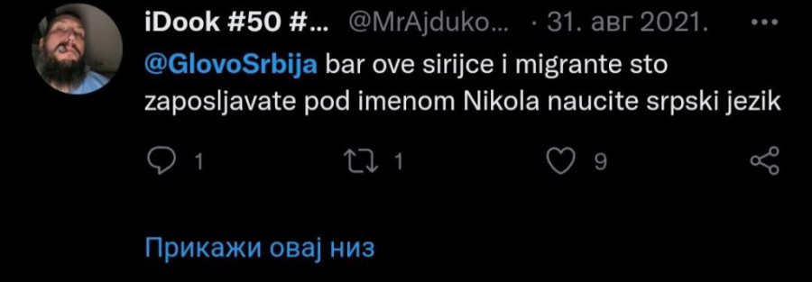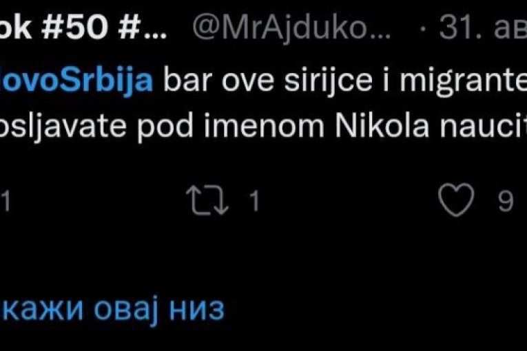 - Bar ove Sirijce i migrante što zapošljavate pod imenom Nikola naučite srpski jezik - navodi korisnik upisan kao Mr Ajduković.