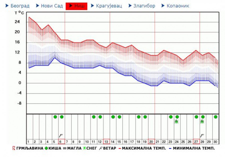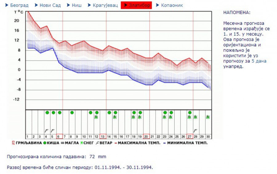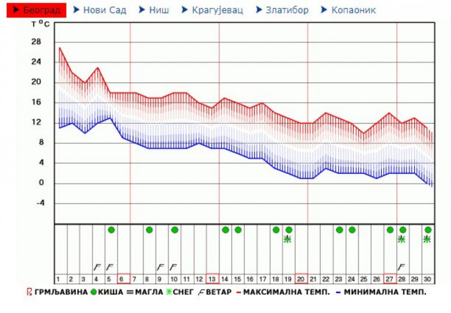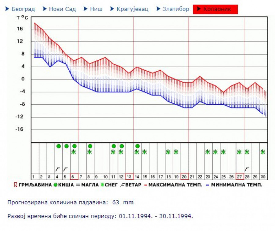 Republički hidrometeoročoški zavod Srbije (RHMZ) izdao je prognozu za narednih mesec dana i najavio prvi sneg ove sezone za početak novembra na planinama, sredinu meseca u večini gradova i kraj novembra na jugu naše zemlje.