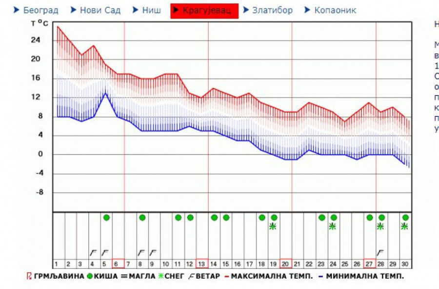 Najavljene su i snežne padavine, a prvi sneg se očekuje 6. novembra na Kopaoniku. Na Zlatiboru će se zabeleti 12. ovog meseca.