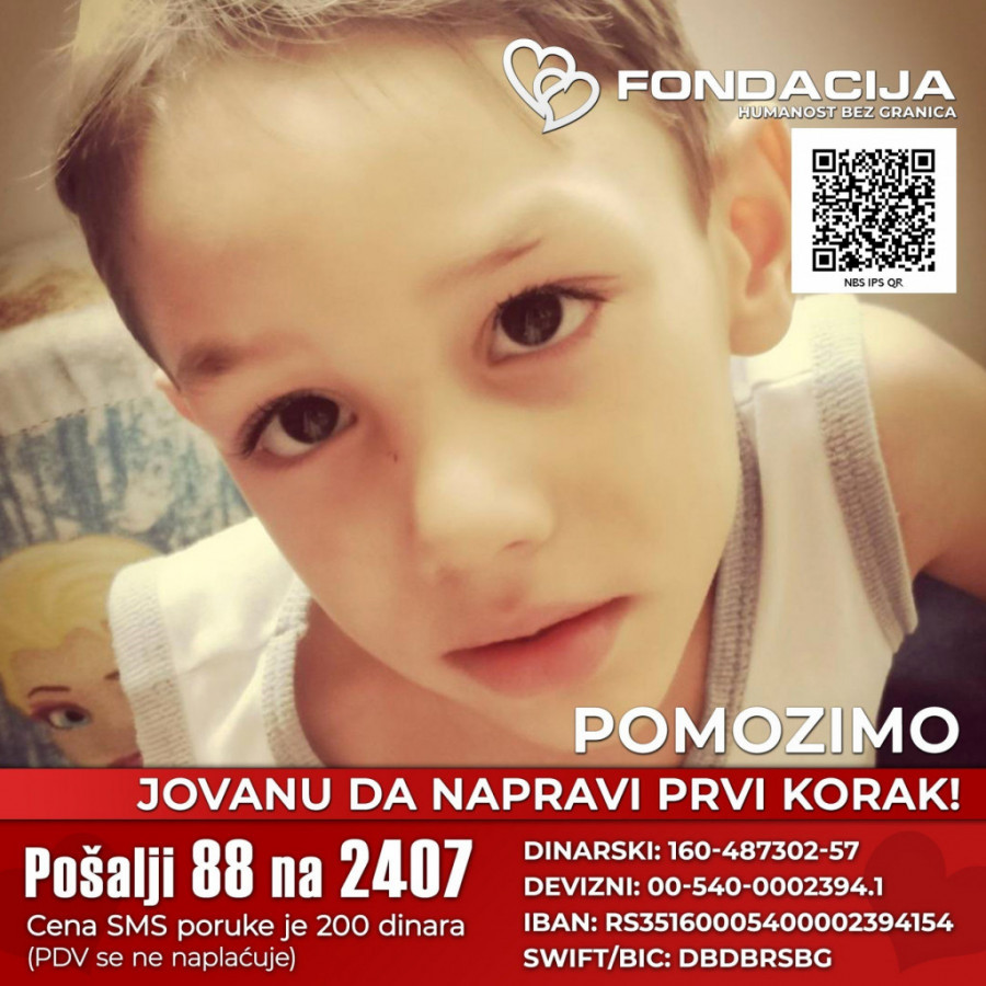 Ovim putem pozivamo sve ljude dobre volje da pomognu Jovanu u njegovoj borbi za prvi korak, tako što će preko FONDACIJE – humanost bez granica, poslati SMS sa brojem 88 na 2407. Uplate za pomoć u lečenju mogu se izvršiti i na dinarski i devizni račun korisnika i putem E-doniraj internet plaćanjem platnim karticama iz celog sveta, kao i preko PayPal-a.