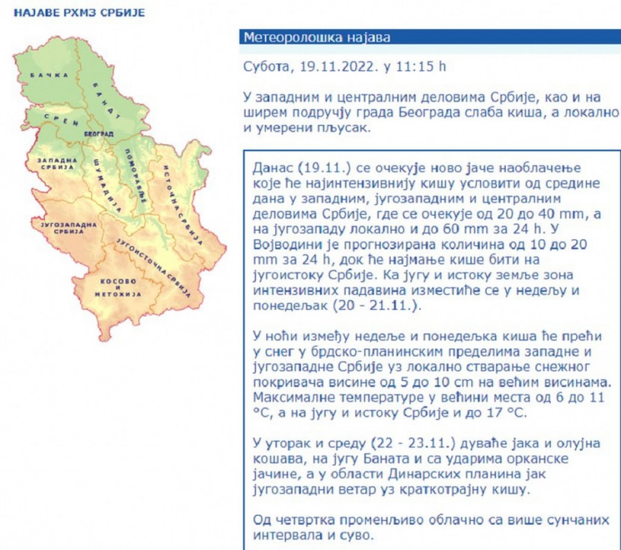 Kako je prognozirano, danas, 19.11, se očekuje novo jače naoblačenje koje će najintenzivniju kišu usloviti od sredine dana u zapadnim, jugozapadnim i centralnim delovima Srbije, gde se očekuje od 20 do 40 mm, a na jugozapadu lokalno i do 60 mm za 24 h. U Vojvodini je prognozirana količina od 10 do 20 mm za 24 h, dok će najmanje kiše biti na jugoistoku Srbije. Ka jugu i istoku zemlje zona intenzivnih padavina izmestiće se u nedelju i ponedeljak, odnosno 20 i 21.11.
