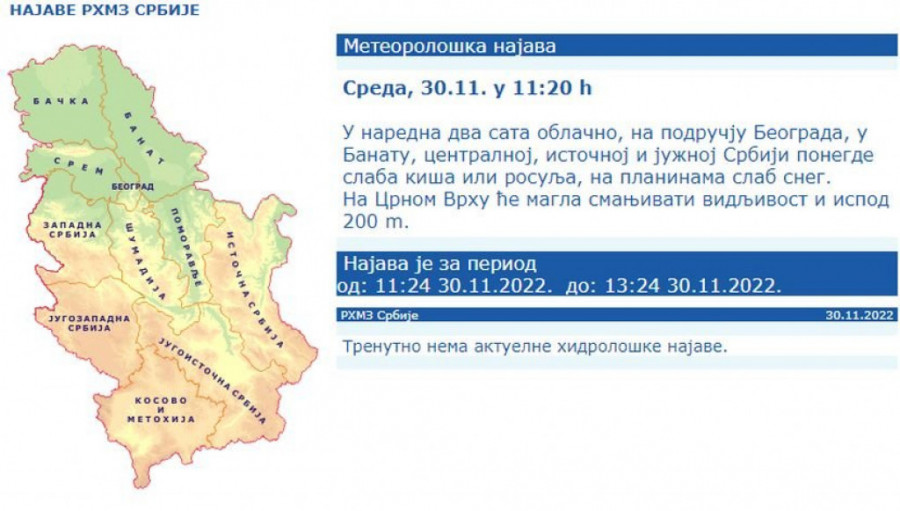 Što se današnjeg dana tiče, prema najavi, u naredna dva sata oblačno, na području Beograda, u centru Banata, centralnoj, istočnoj i južnoj Srbiji ponegde slaba kiša ili rosulja, na planinama slab sneg.