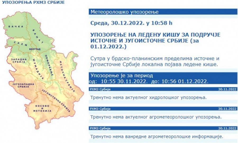 Naime, RHMZ je za sutra izdao upozorenje na ledenu kišu.