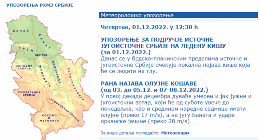 Republički hidrometeorološki zavod je izdao i upozorenje za period od 3. do 5. decembra, kao i za period od 7. do 8. decembra.