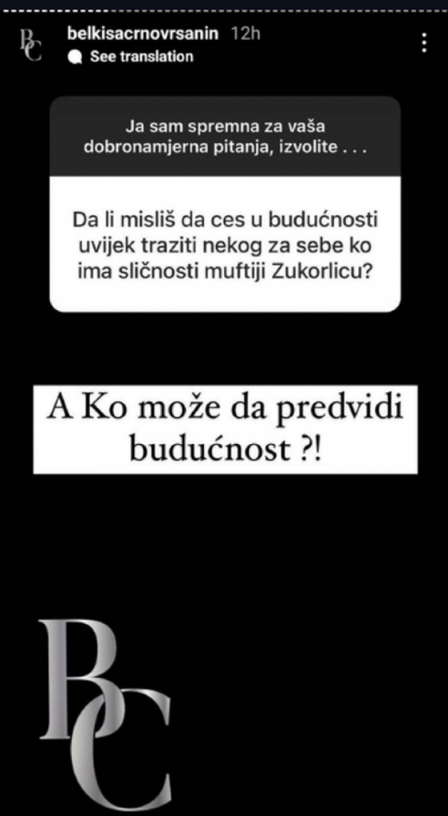 Novinarka iz Novog Pazara i navodno treća žena po šerijatu pokojnog muftije Muamera Zukorlića, Belkisa Crnovršanin, objavila je na svom Instagram nalogu da pratioci mogu da joj postavljaju "dobronamerna" pitanja. Neka od njih podelila je na svom storiju. Međutim, jedno je privuklo veliku pažnju.