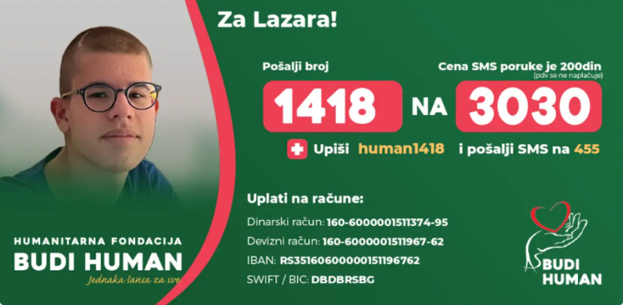 Lazaru možete pomoći donacijom preko fondacije Budi human i to uplatama na sledeći način: