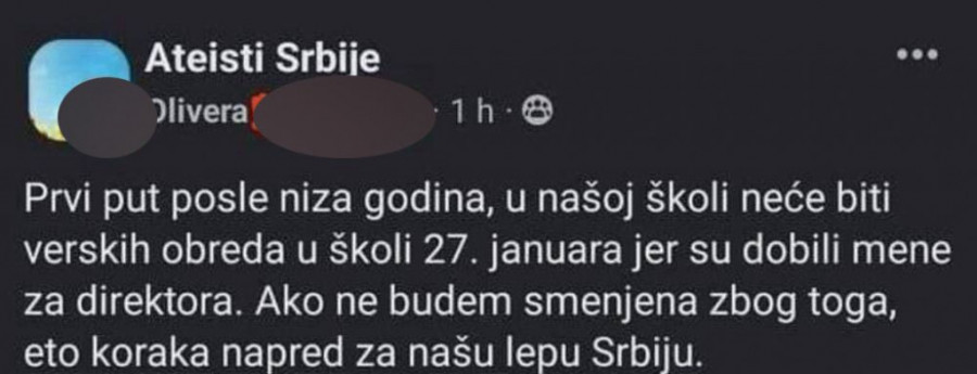 "Verski obredi biće zabranjeni u ovoj školi, jer su dobili mene za direktorku" , stoji u objavi koju je direktorka Olivera Marjanović navodno napisala u kontroverznoj grupi Ateisti Srbije.