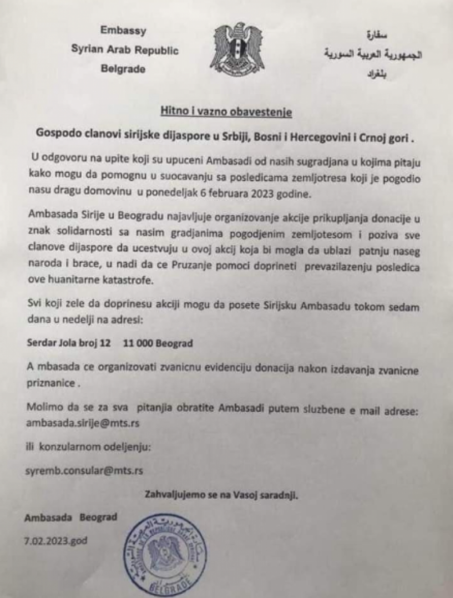 Svi građani Srbije koji su u prilici mogu da pomognu građanima Turske i Sirije, informacije su na sajtovima ovih ambasada. Ambasada Sirije u Beogradu obavestila je svoje sugrađane, članove sirijske dijspore u Srbiji, BiH i Crnoj Gori, da će organizovati akcije prikupljanja donacija, te poziva sve da učestvuju u ovoj akciji.